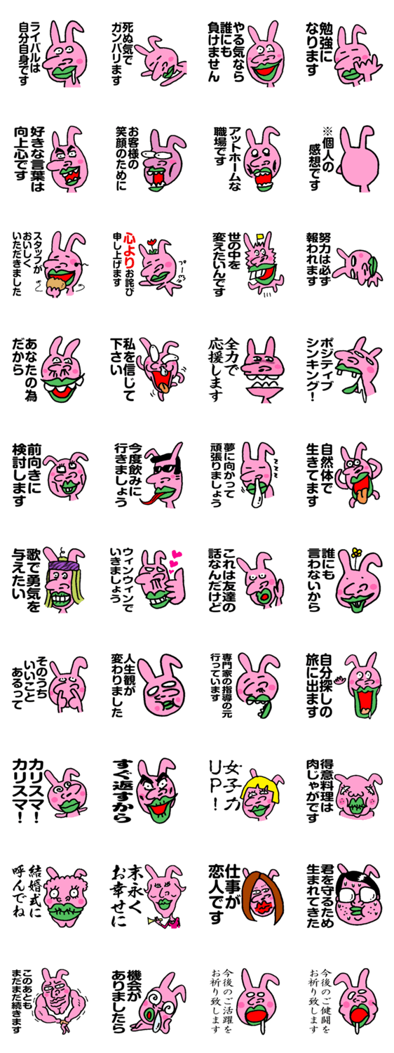 スタンプ説明 うさんくさウサギのうさんくさい言葉スタンプです。そのままの意味で使うもよし!ボケたいときに使うもよし!使い方はア・ナ・タ次第!