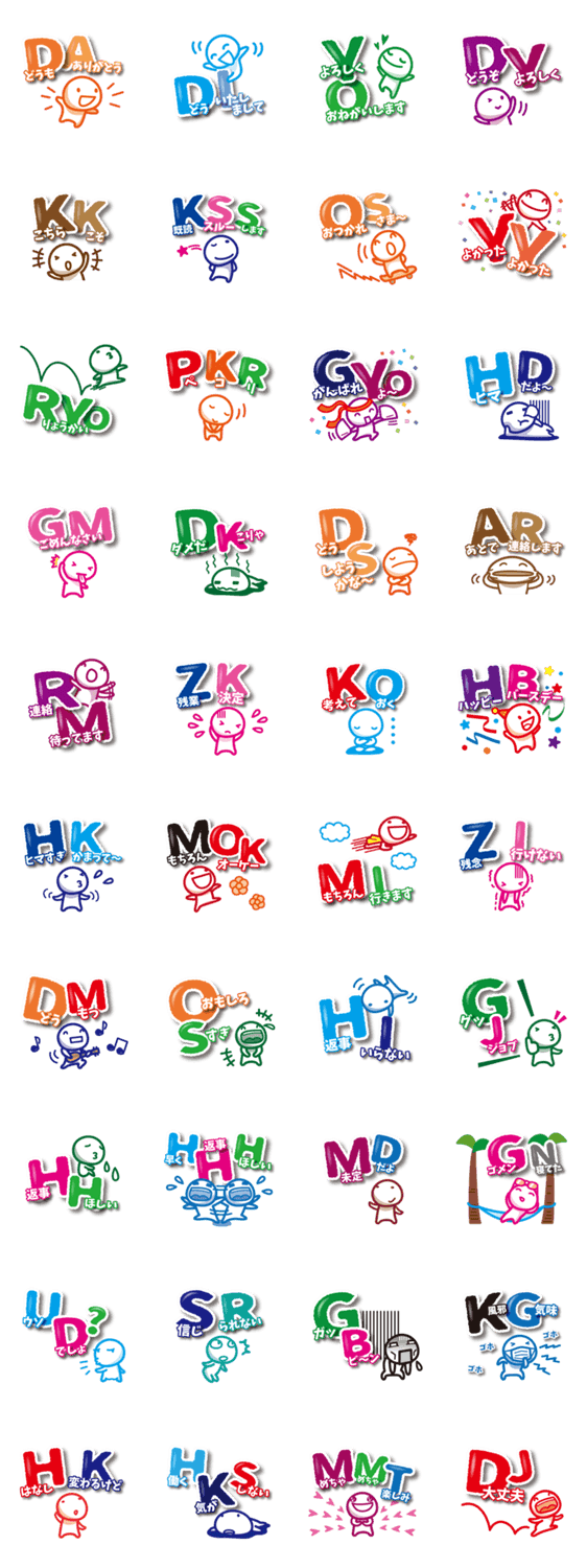 スタンプ説明 なんでもかんでも略語にしてしまう白い妖精たちです。日常会話で使ってやってください。カラフルで楽しいスタンプです。