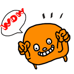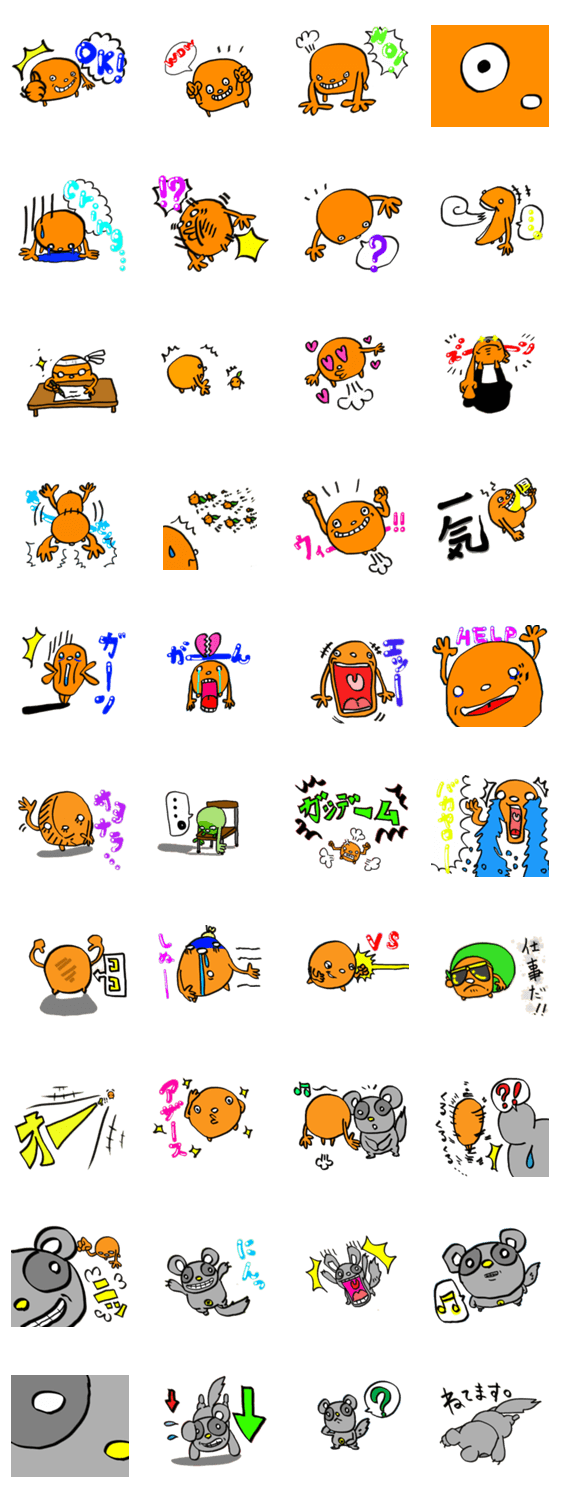 スタンプ説明 オレンジの精霊「ジーモン」♪リアクションがオーバーなのが特徴!!よろしく!!!!!おまけでオレンジモンスターの友達「グレイン」もいるよ♪