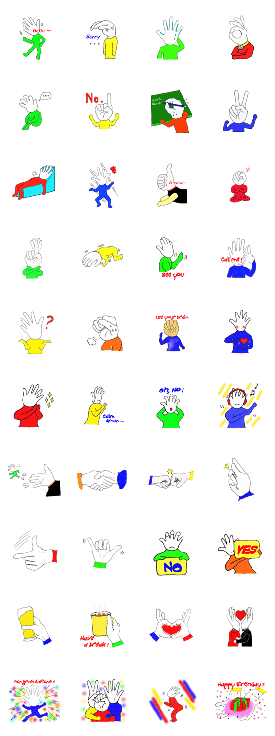 スタンプ説明 会話の中に自然と出てくる手の動き。君に代わってハンドマンがスタンプで伝えてくれるよ。