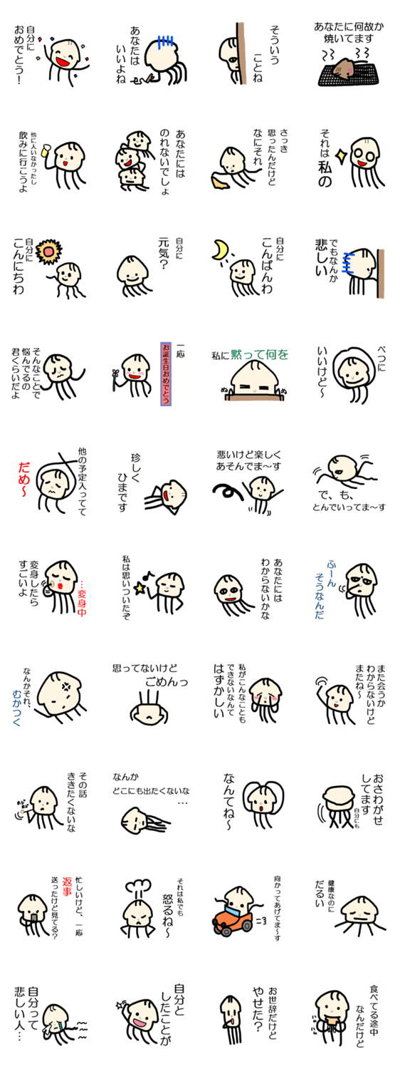 スタンプ説明 失礼な言葉を言うイカくんですが、根はとてもやさしいはずです。状況が様々なスタンプですので、いろんな時に使えるかも?