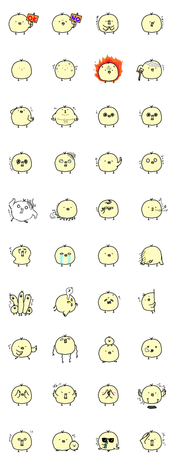 スタンプ説明 まん丸いひよこのような生き物です。自分ではひよこと信じているが実はひよこではない、ひよこのような生き物です。
