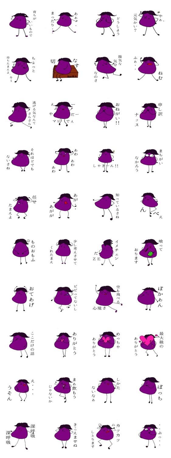 スタンプ説明 日常会話に使いやすいスタンプです。丸々した茄子をちょいちょい使ってみてはいかがだろうか。
