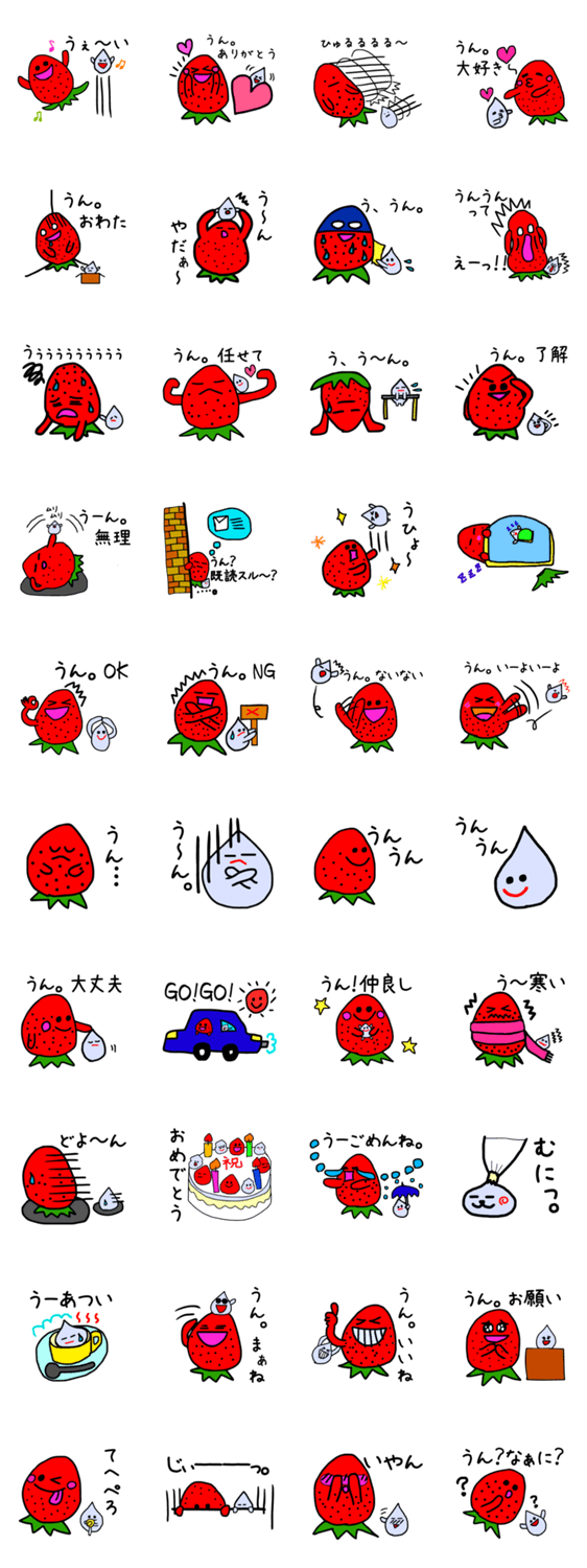 スタンプ説明 うん。うーん。が口癖のいちごとチビクリームの二人がみんなの携帯画面の中で大はしゃぎ!そんな二人の「うんうん劇場」みなさんも二人の様子を覗いてみて下さいね。