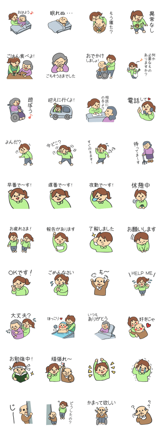 スタンプ説明 ヘルパーさんと高齢者のスタンプです。介護・福祉スタッフ間以外でも気軽に使える、コミュニケーションスタンプです。