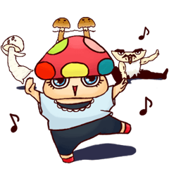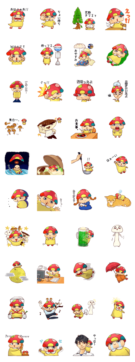 スタンプ説明 土弧鹿乃村に住む、きのこの妖精「きのこちゃん」とお友達が、色んな表情で気持ちをお伝えします。