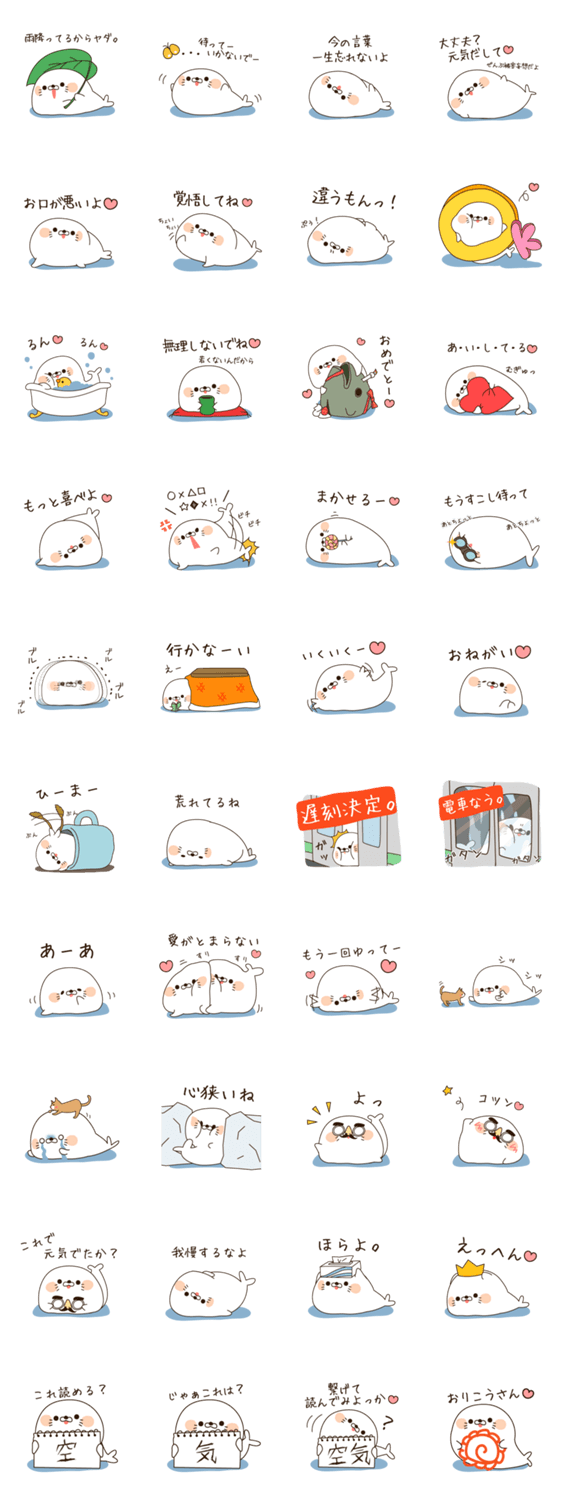 スタンプ説明 人間正直が一番。言いづらい事を代弁してくれる、かわいい毒舌なアザラシさんの第5弾です。