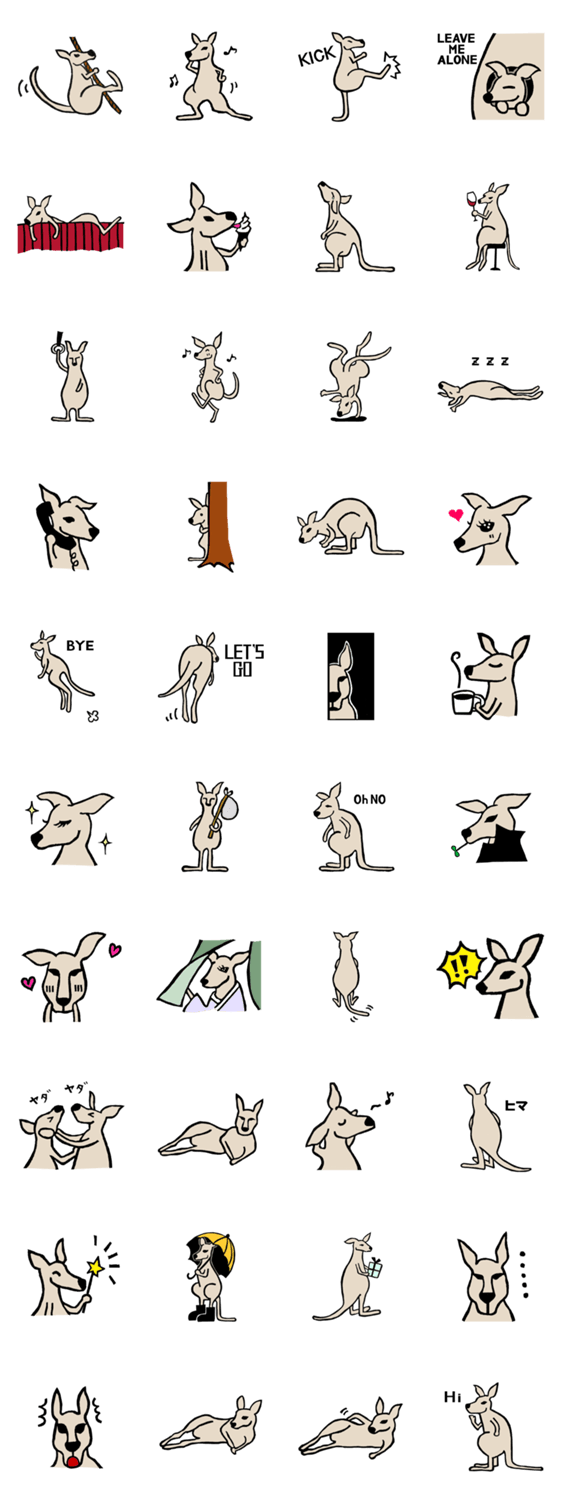 スタンプ説明 一つ一つ消しゴムを手彫り&加工して作った、日々の会話に彩りを添えてくれるクールなスタンプ「カンガルーな毎日」です。