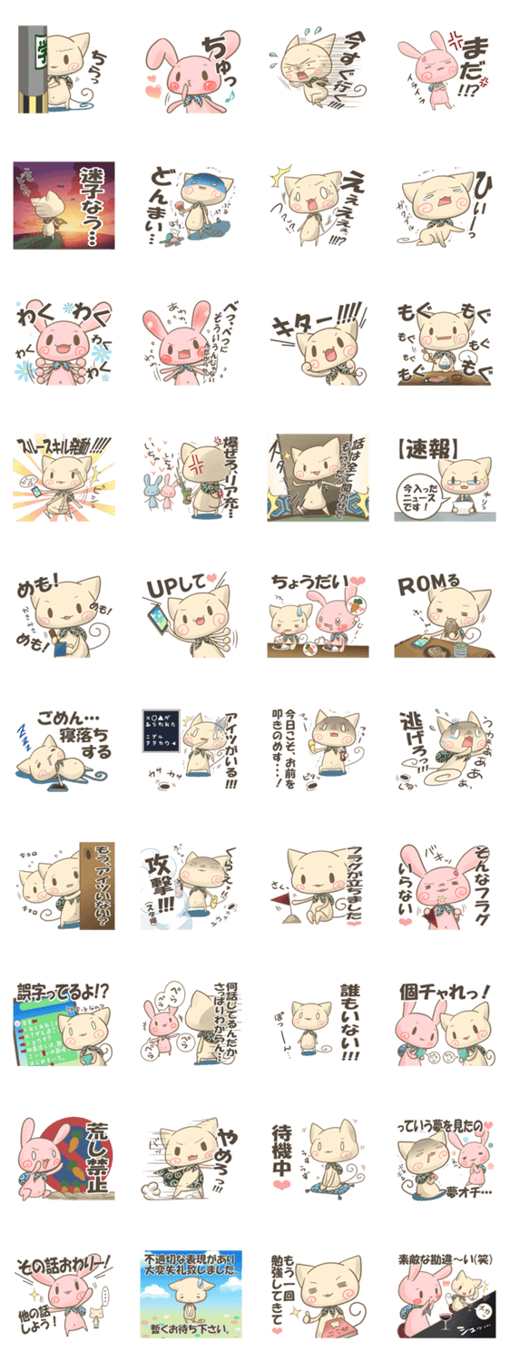 グループトークで使いやすい!ぐるぐるほっぺが可愛い、猫と兎のスタンプ第二弾です。