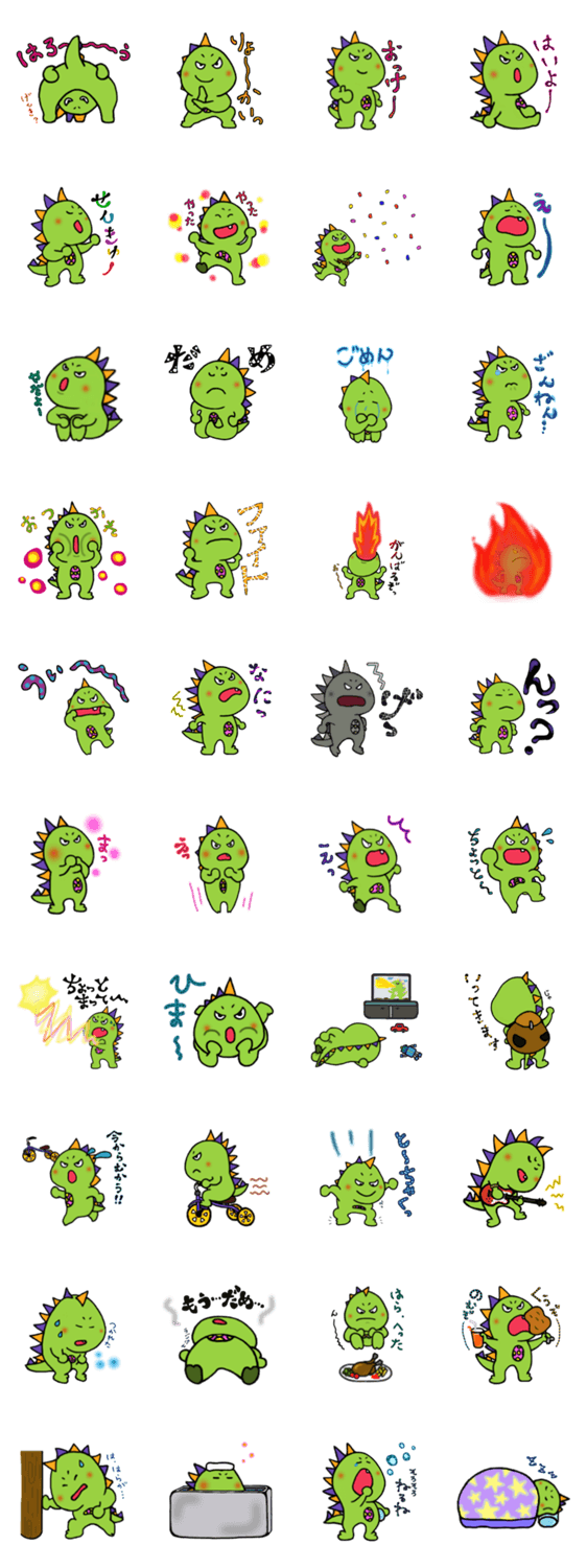 スタンプ説明 とってもやんちゃなこどもかいじゅー。のびのび自由に気持ちを表現します。あなたのLINEの中でかわいがってあげてください。
