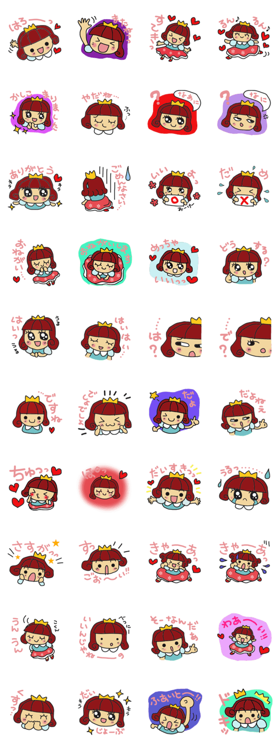スタンプ説明 姫ちは可愛いくてわがままなお姫様。気分屋さんで泣いたり笑ったり、上げたり下げたり、ツクしたりツキ放したり。だって女の子なんだもーん。