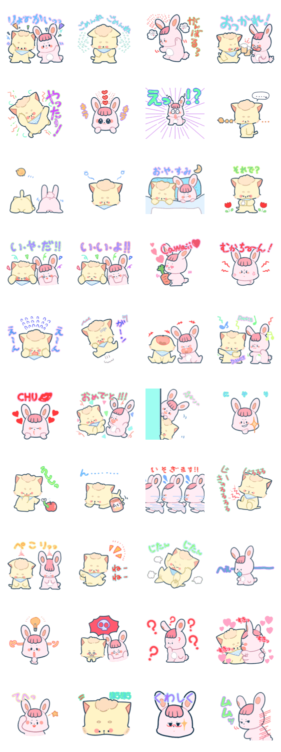 スタンプ説明 黄色い猫とももいろウサギのコミカルで可愛いスタンプです。沢山の用途に使ってください。