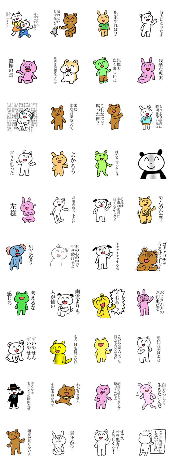 ニコニコ森の仲間たちはとても仲良し。今日も元気にニコニコしているよ。煽りやネガティブな話題にぴったりの楽しいスタンプだよ。絵が若干改善したよ!