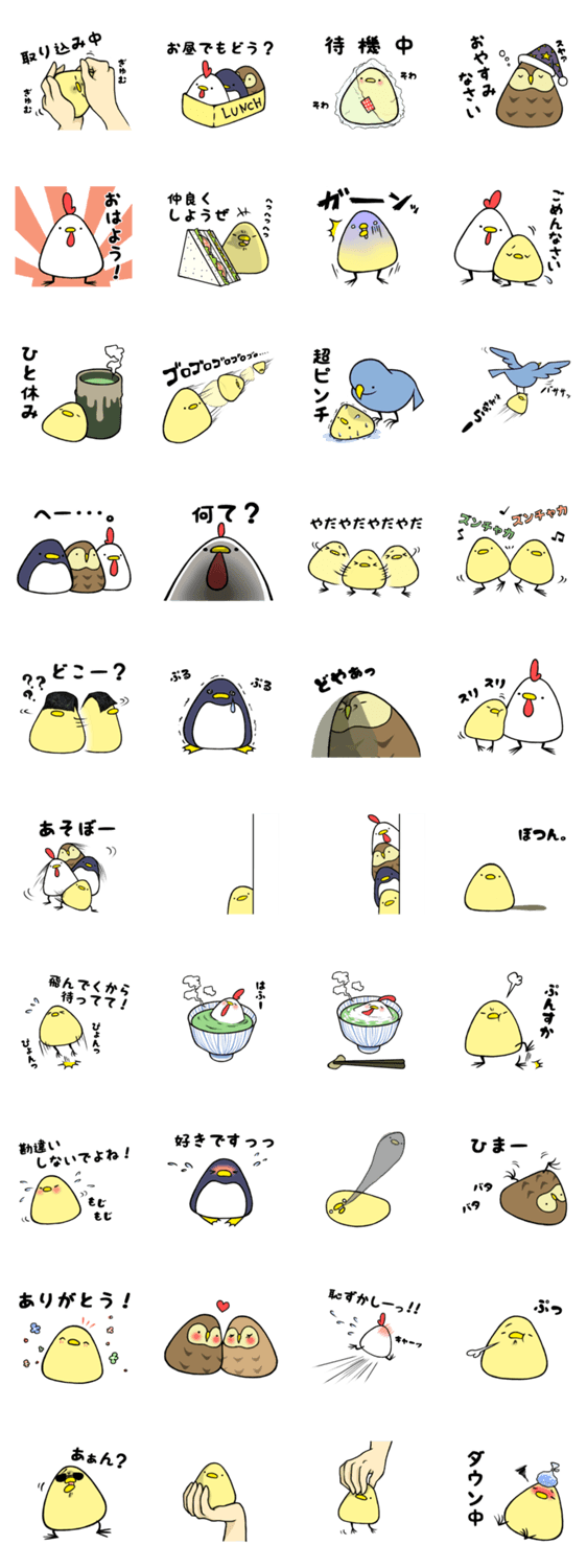 スタンプ説明 さんかくおにぎりのようなフォルムの鳥キャラクター達です。握られたり、お弁当箱に詰められたりと、可愛くてクスッとしてしまうスタンプ。ぜひ使ってみてください☆