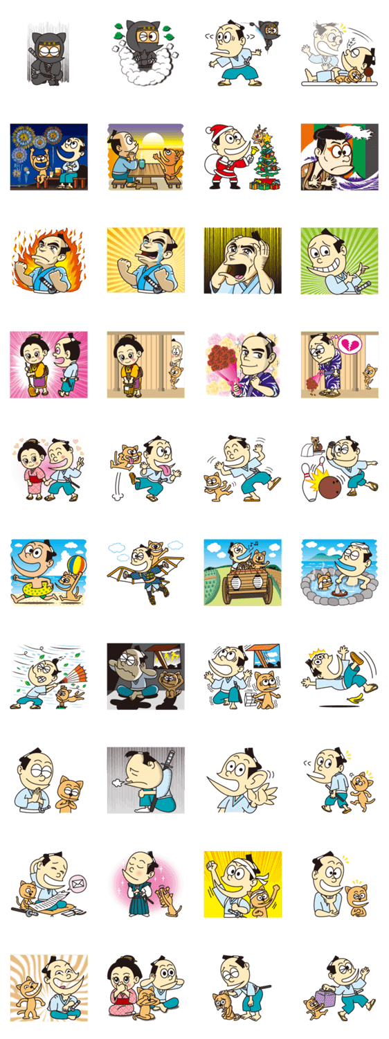 スタンプ説明 日常の喜怒哀楽をお侍さんで表現した第3弾。相棒の猫とともに、わかりやすくて使いやすい感情表現いっぱいのスタンプです。