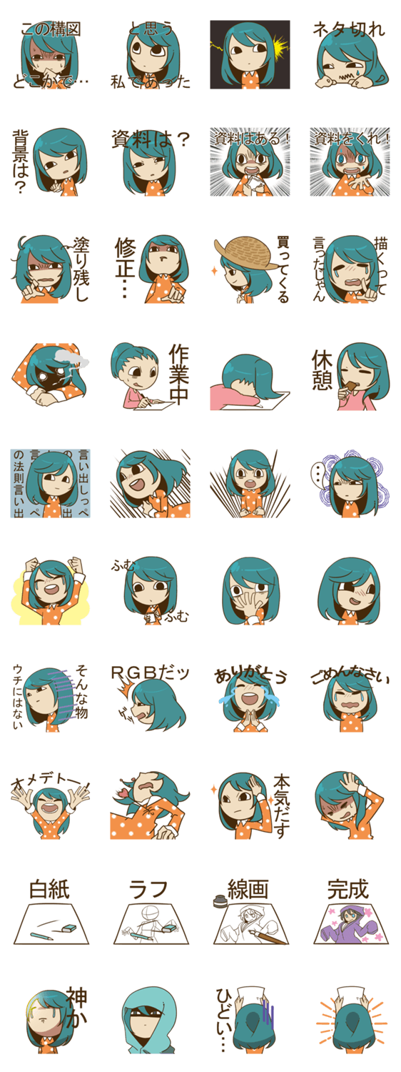 スタンプ説明 ちょっとローテンションでジト目な絵描きのエミの日常スタンプ。絵を描く人なら共感できる?