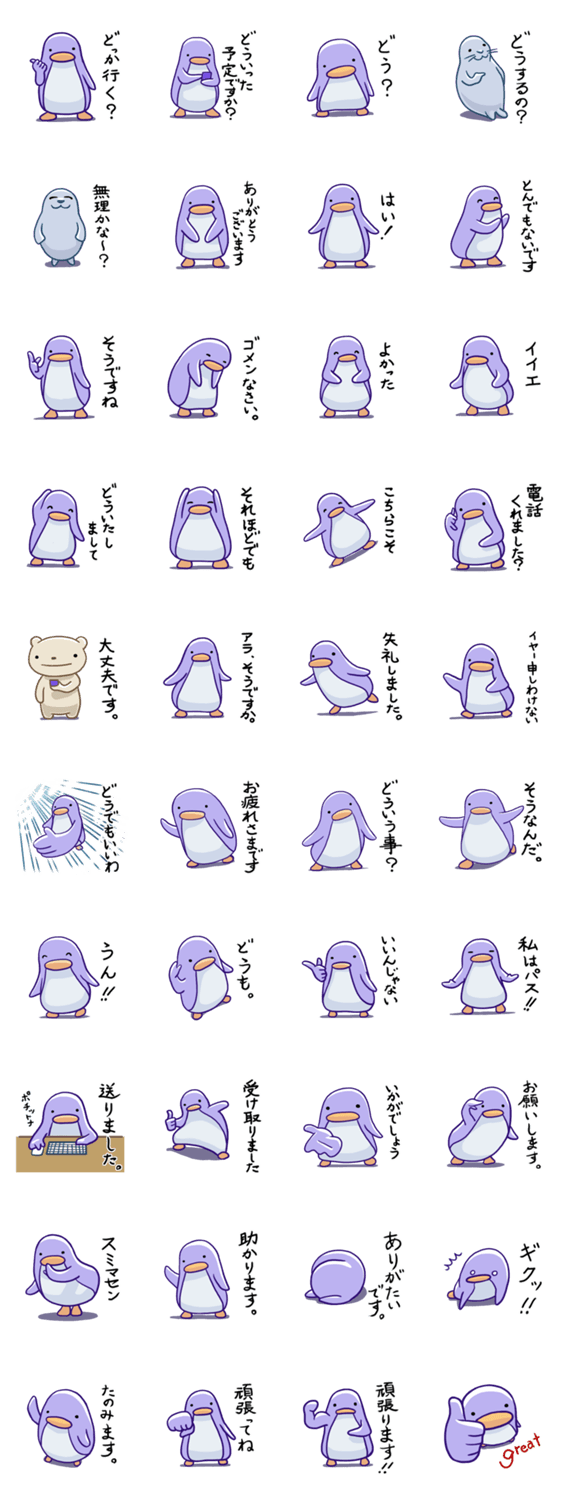 スタンプ説明 ぺんちゃんずスタンプの第4弾。今度は、すぐに返事しやすいセリフを入れました。