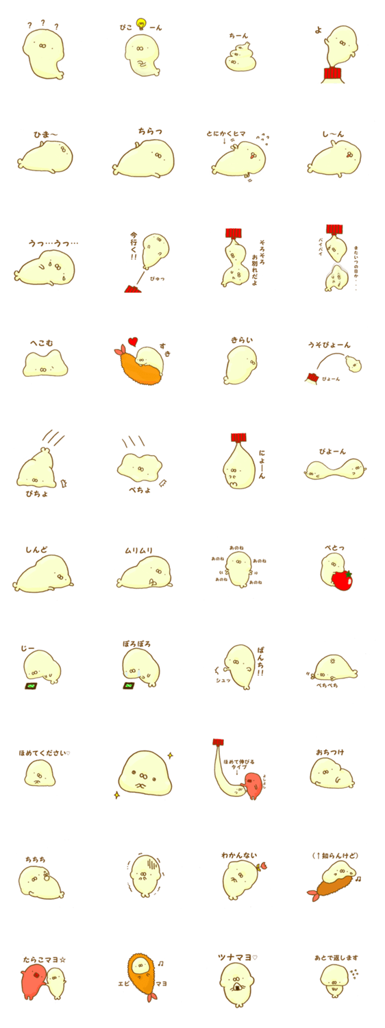 スタンプ説明 マヨネーズでできたあざらし「マヨざらし」の、ゆるくて可愛いスタンプです。つるつるもちもちしています。エビフライが好きです。