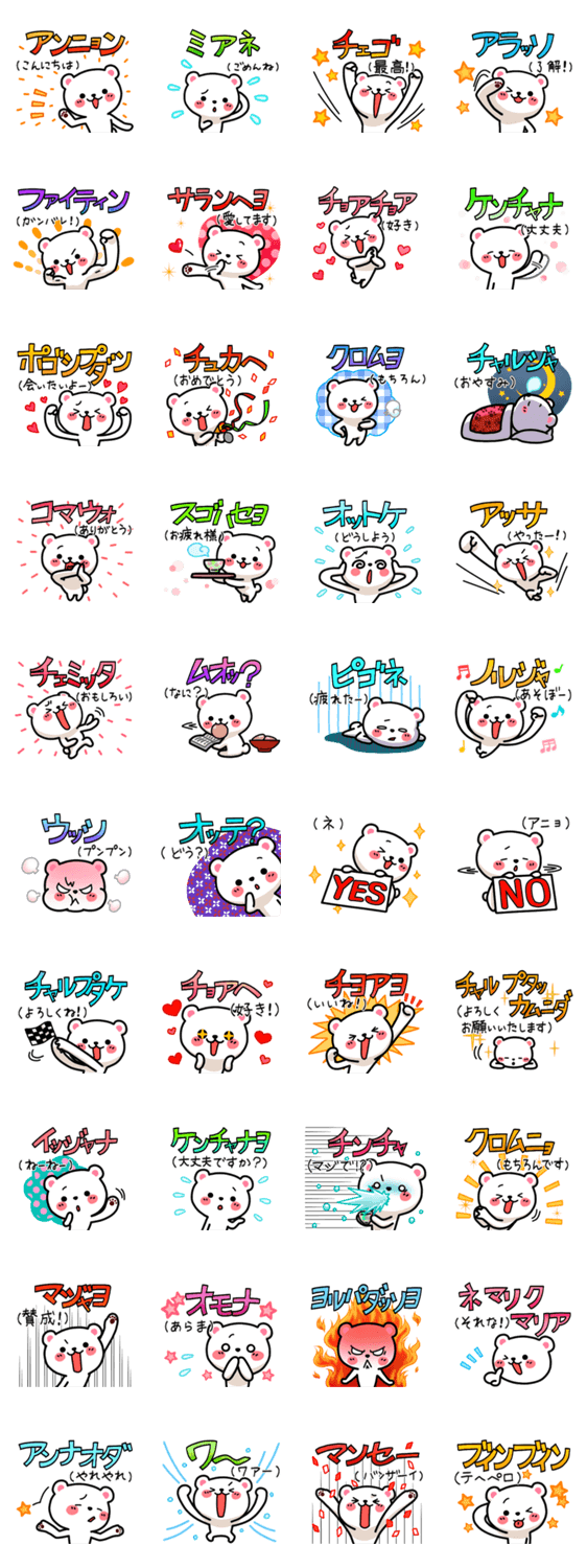 スタンプ説明 韓国語のゆるくま第二弾。日常でよく使う言葉や挨拶や相槌などをいれて見ました。友達や主婦の方や彼氏や彼女の恋人同士、家族や先輩みんなでハングルを楽しもう