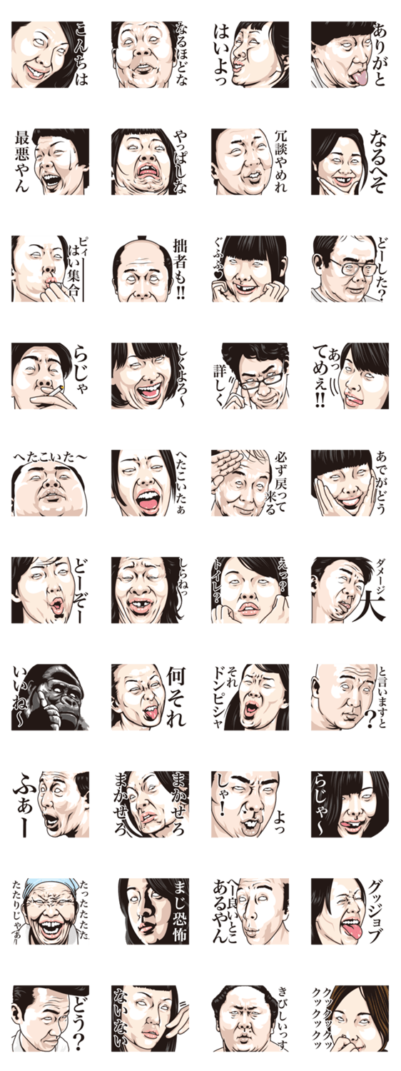 スタンプ説明 しろめ爆弾の第2弾!日常会話をさらにおもしろおかしく白目変顔で対応。この攻撃に君の仲間は耐えられるか!?人にまぎれてゴリラさんも白目で対応しているよ。