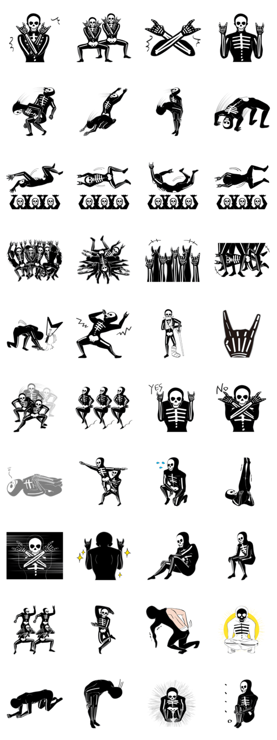 スタンプ説明 メタラーのためのメタル風スタンプ。ガイコツの全身タイツを着用した、骨男のゆるい日常です。