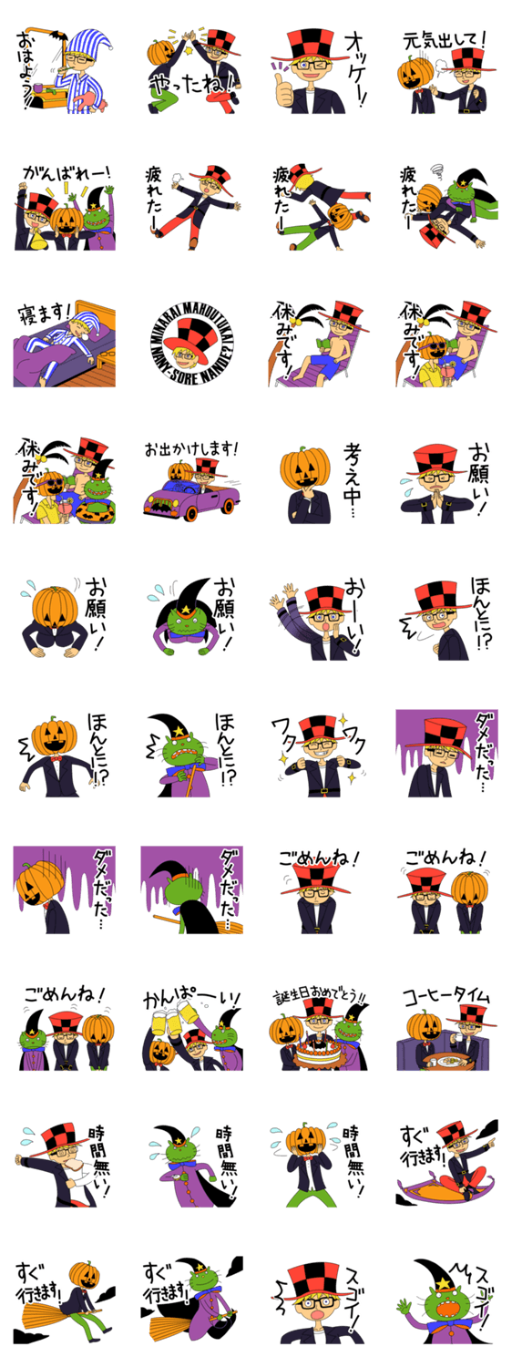 スタンプ説明 見習い魔法使い ナニーソレナンデ?が開催している「世界一小さなマジックショー」のハロウィンイメージのスタンプです。楽しい仲間も登場致します。