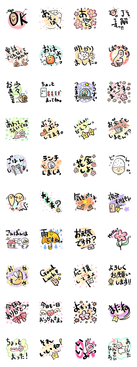 スタンプ説明 日常でよく使うお礼や挨拶などをいろんなニュアンスバージョンでつくってみました。なぜか全部笑顔。ほんわかした色を描きたくて。ほんわかすたんぷとしました。