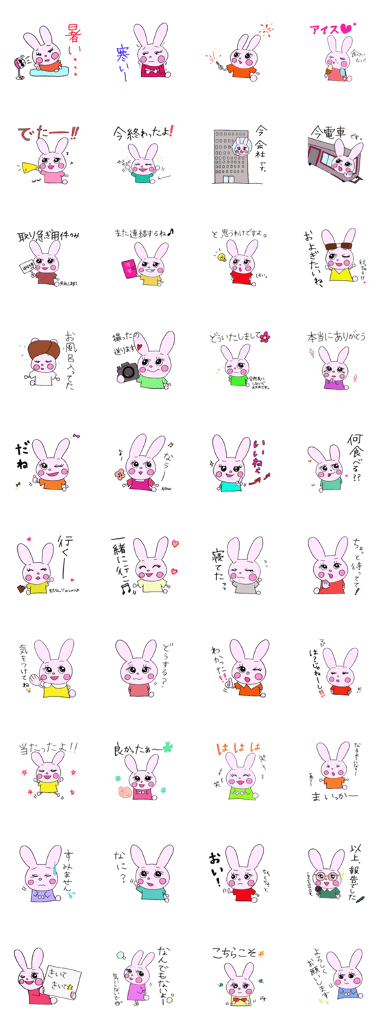 スタンプ説明 日常よく使う言葉を集めたゆるうさぎのうあうさスタンプ、第二弾。忙しい時でもカラフルなスタンプで可愛く会話しちゃおう!夏にも使える!