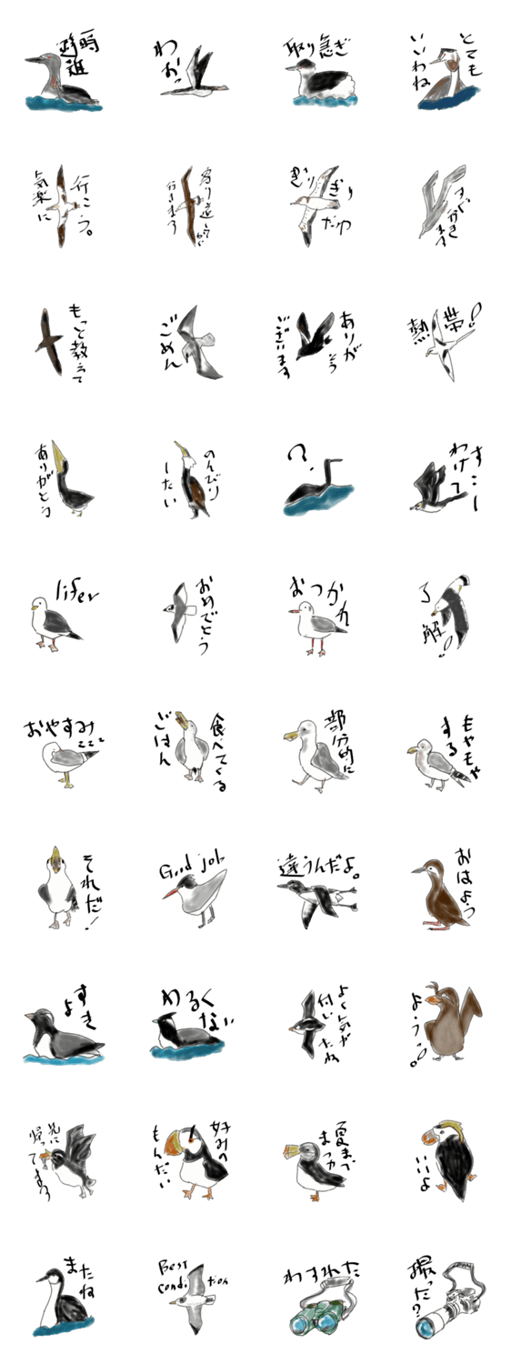 鳥屋待望の海鳥スタンプです。カモメ、ミズナギドリ、アホウドリ、ウミスズメ、ケイマフリなど様々な海鳥を収録しました。ご友人との野鳥観察の日程調整に最適です。