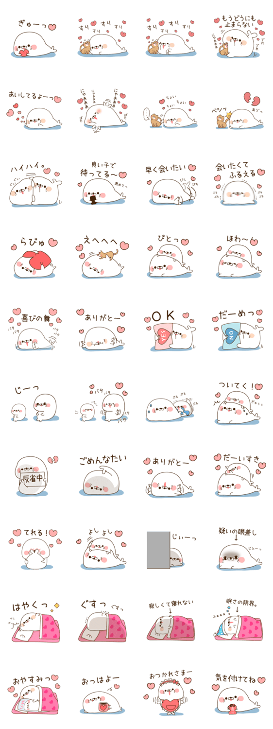 スタンプ説明 人間正直が一番。言いづらい事を代弁してくれる、かわいい毒舌なアザラシさんの番外編!リクエストにお応えして、ハートまみれで愛がとまらないあざらしさんです。
