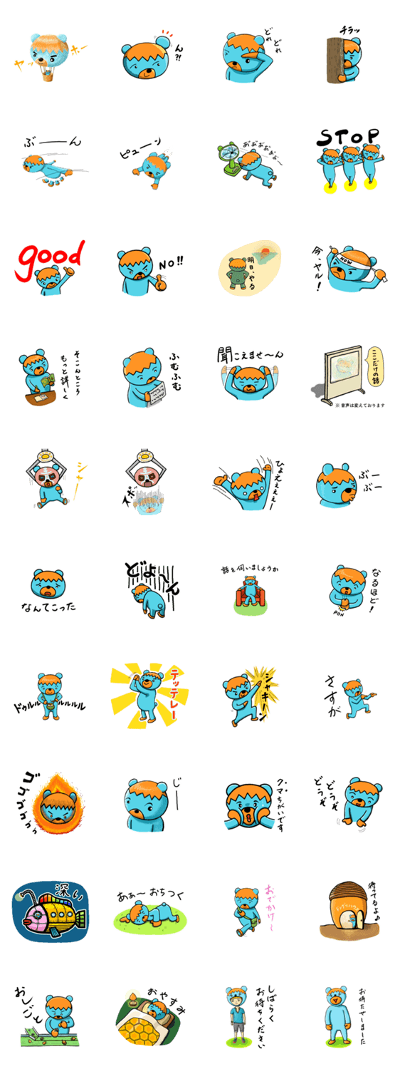 スタンプ説明 ドングリ好きな青いくまのアオクマさん。若者から高齢者まで幅広く愛される熊だから、送る側も送られる側も嬉しいスタンプです。