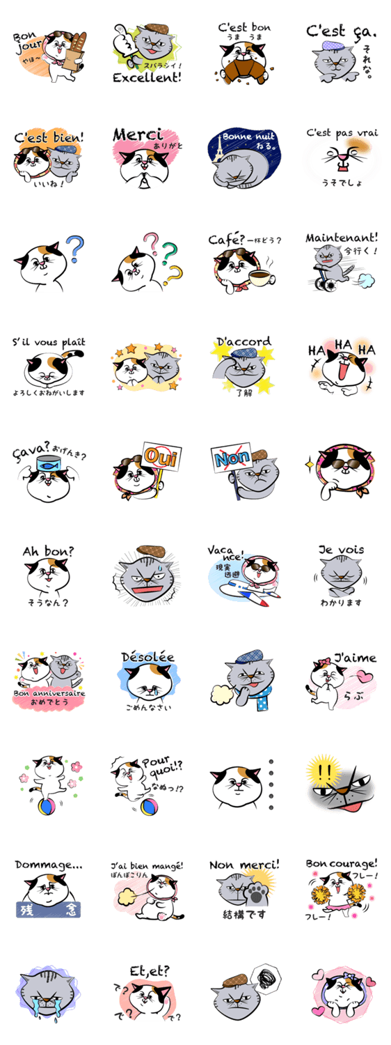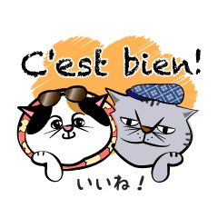スタンプ説明 のんきで人懐っこいマリー(♀)と、ひねくれながらも気の小さいフランソワ(♂)。フランス語をしゃべるねこのコンビです。