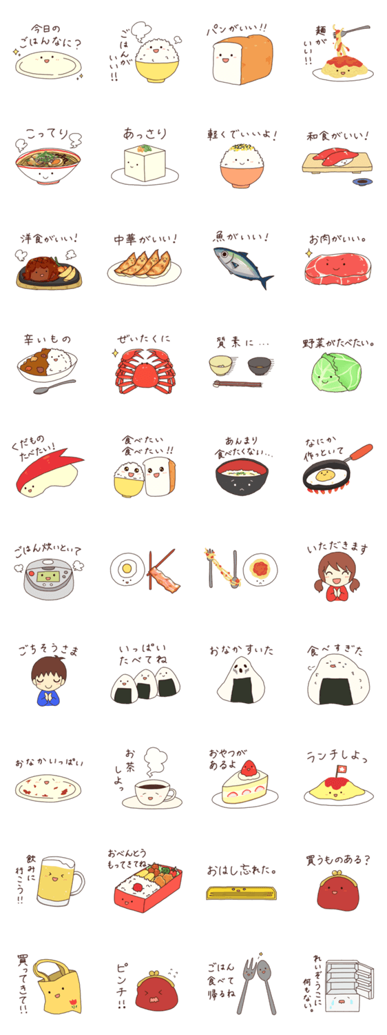 スタンプ説明 「ごはん」に関するメッセージに使えるスタンプです。食事のお誘いや夕飯のリクエスト、おつかいを頼んだり、いろいろ使えます。