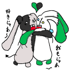 スタンプ説明 人影に住みつく、厨二病をこじらせたツギハギ兎のカップルのどこか痒くなるようなスタンプ。このツギハギは運命の糸。白黒はスクラッターで緑白はレスク。