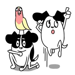 スタンプ説明 お茶目なミックス(犬)のルタとアヴァン。コザクラインコ(鳥)のポポとは今日も仲良し!頑張ってトークを盛り上げます!