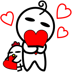 スタンプ説明 白い小さな男の子と鶏さんです。言葉は無くても目力で伝える!