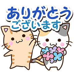 スタンプ説明 『お茶目な三毛猫』と『おちゃめなトラネコ』のペアねこスタンプ。敬語や丁寧な言葉のカラフルな文字のスタンプ。かわいく楽しく返事ができます。【かたこ】