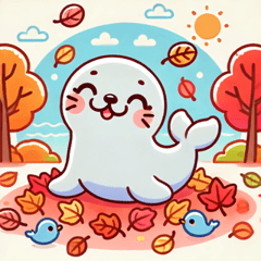 スタンプ説明 紅葉狩りを楽しむかわいいあざらしたちが、さまざまな感情を表現します。幸せ、驚き、愛などの気持ちをチャットで伝えましょう!