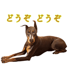 スタンプ説明 リアルタッチのドーベルマンが太鼓持ちをつとめるスタンプです。 ビジネスでも活躍すること間違いなしです。