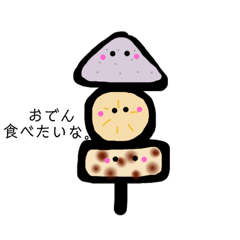 スタンプ説明 冬のお供の食べ物たち、肉まん、おでん、焼き芋、食べたい、アイス、ビール、みかん、ココア、たこ焼き、乾杯、あたたまろ