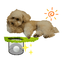 スタンプ説明 スイング、へたっぴでもプードルなので多めに見てね。今度は、バンカーに入っちゃったし、ボールをやっぱりくわえてみたくなっちゃったり。