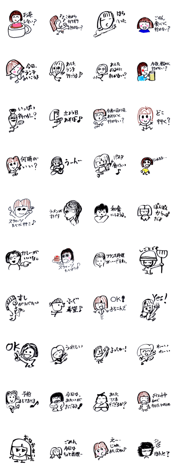 何が食べたい?どこに行く?ランチに行きませんか?飲み会しましょう。今夜、ディナーに行きましょう。など、スウィーツや食事に誘うときに使えるスタンプです。