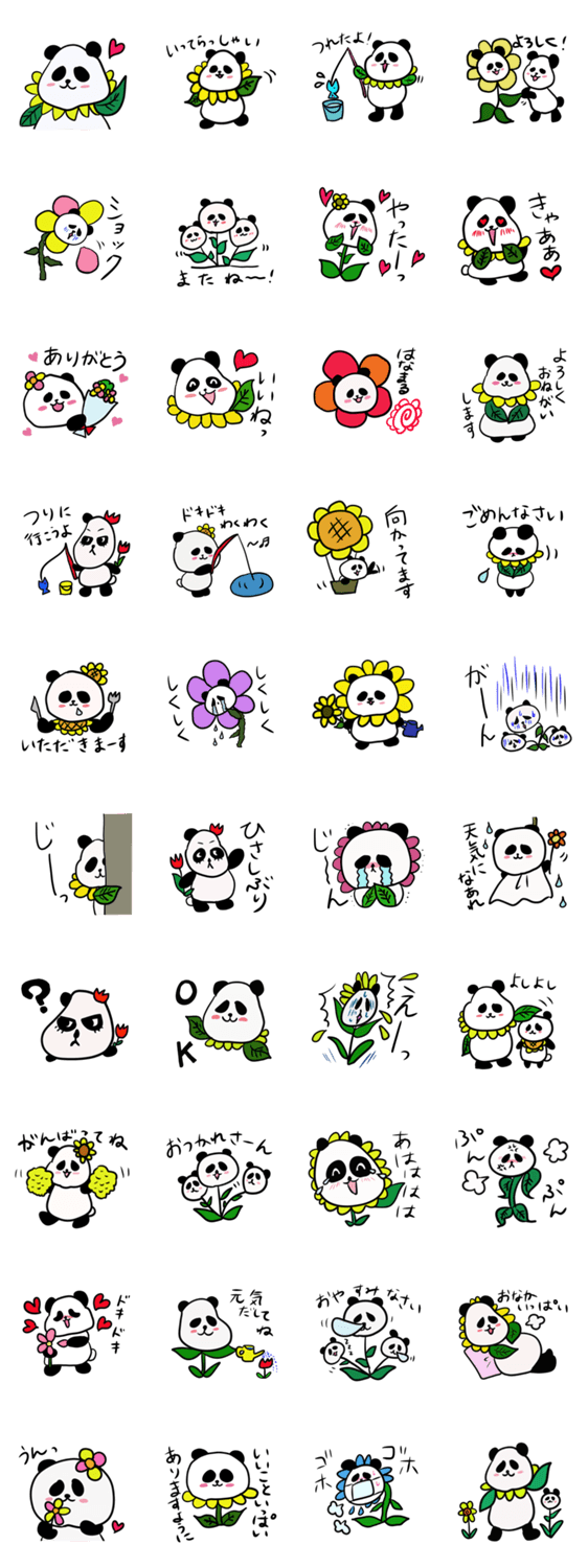 パンダ愛好家必見!パンダとお花のコラボ。あなたもシュールで不思議な姿に癒されるかも。おもしろスタンプが好きな方にもおススメです。簡単な挨拶付きで便利です。
