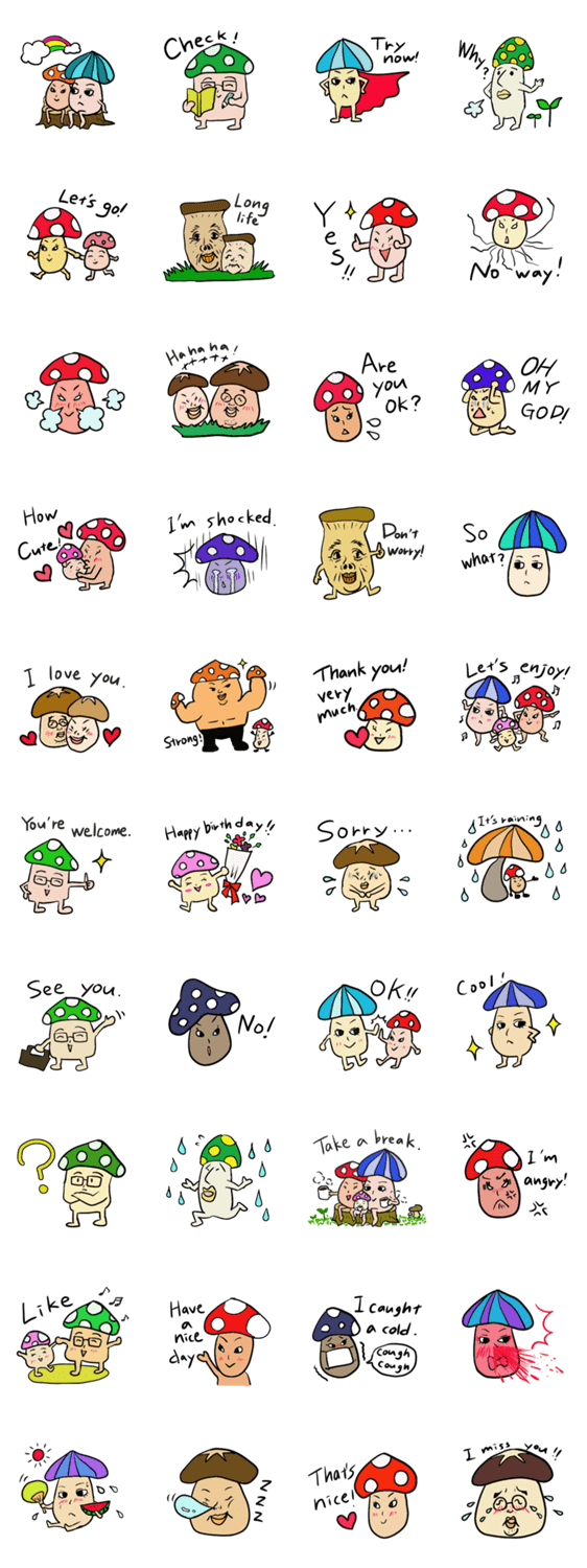 シュールで愉快なきのこのスタンプ。 恋人、家族、友達全てに使えます。 周りの誰かに似ているかもしれません。 簡単な日常会話の英語を使っているので色々な国の方にも!