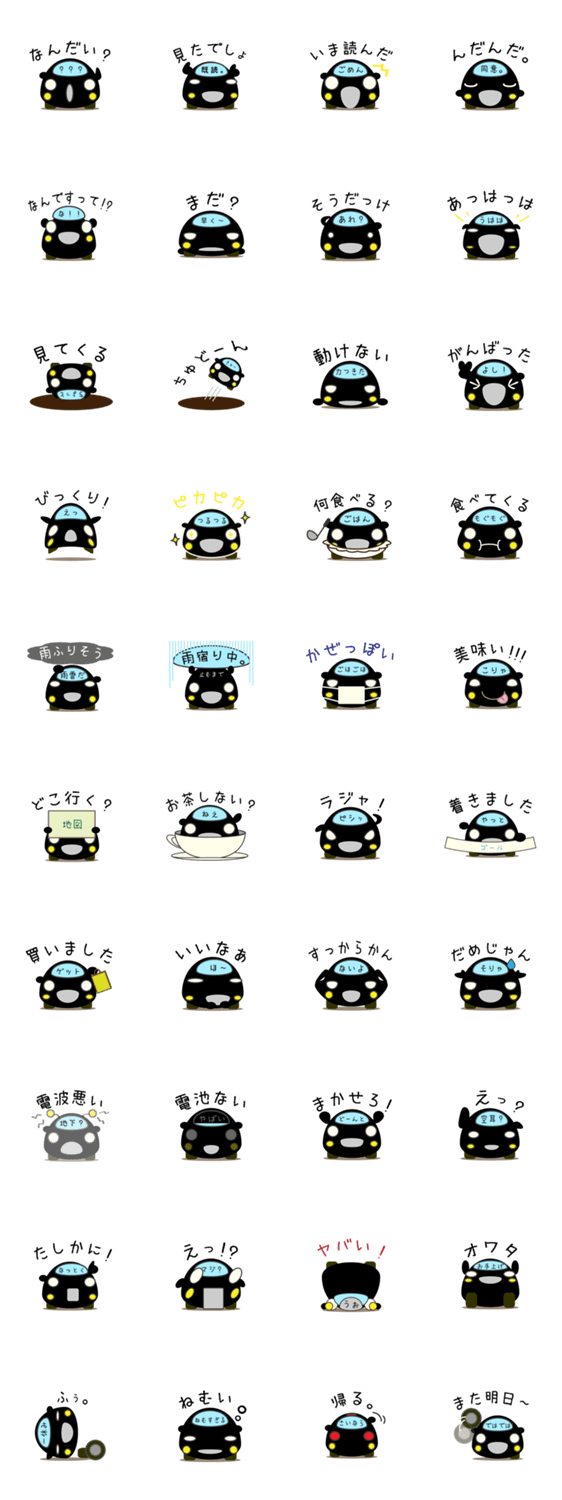 大福みたいな形をした愉快な黒い車のスタンプ、日本語セリフ付きです。