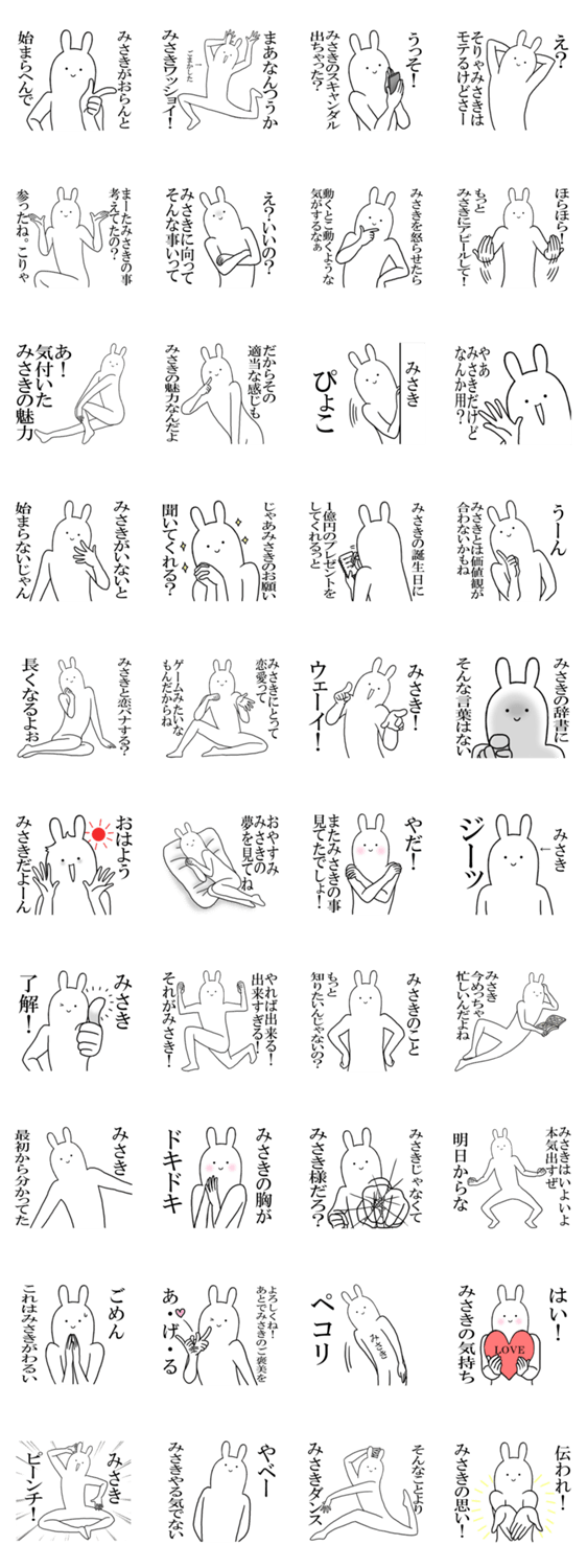 みさきちゃんが使えるシュールな名前スタンプ。岬,美咲,実咲,美岬,岬咲,美紗希,美沙希,三咲,未沙希などみさきちゃんが使えるスタンプだよ