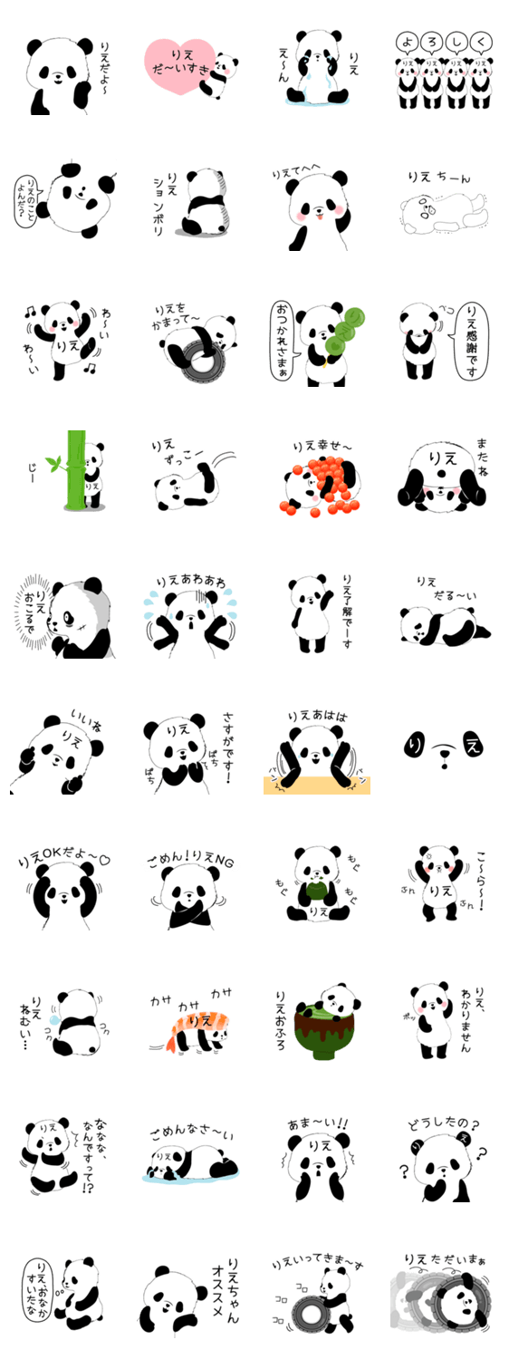 りえちゃんが使う名前スタンプ。りえ、りえこ、りえか、りえなの名前の方どうぞ。ゆるいぱんだらけのスタンプで人気者りえちゃんになろう!