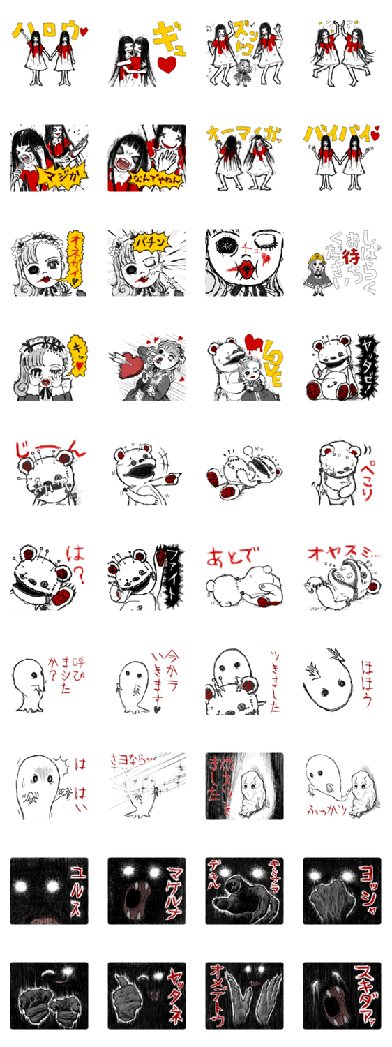 ポジティブな気持ちを素直に伝えるのが苦手なあなたに! 双子の少女の幽霊、呪いの人形、壊れたくまのぬいぐるみ、小さなおばけと亡霊など、一見怖いがみんな明るく前向き!