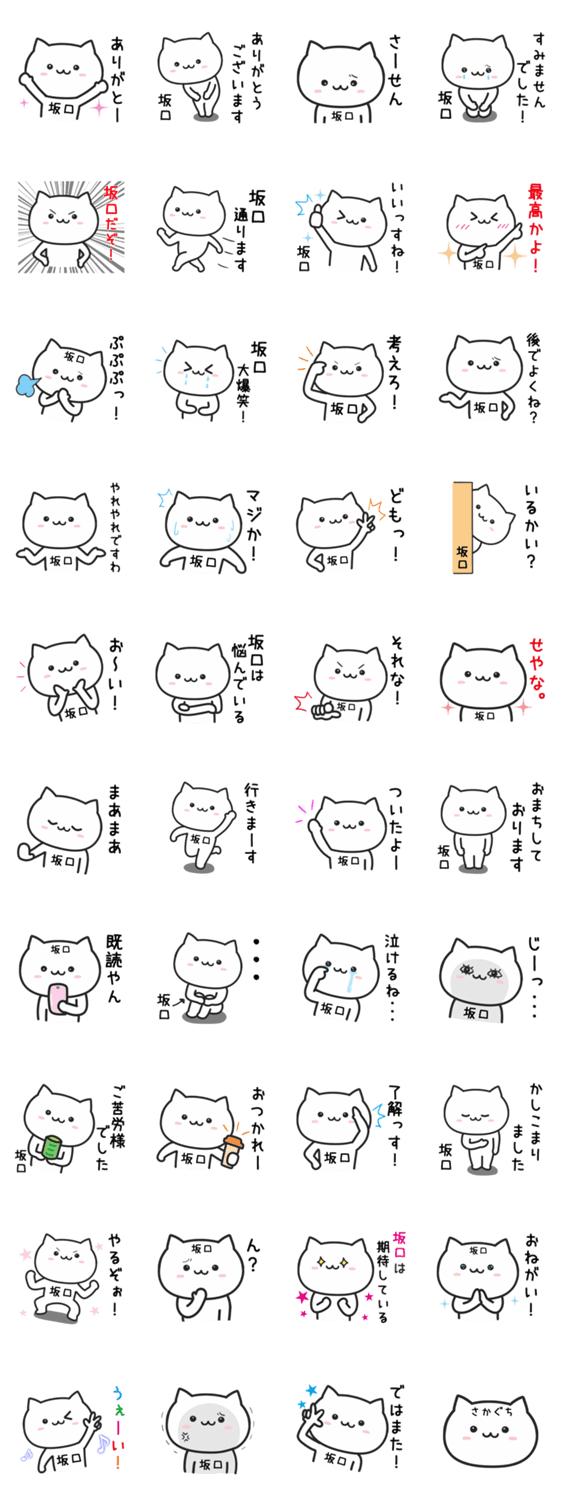 名字(苗字)が坂口(さかぐち)の人が使える、ねこの名前スタンプです。日常会話で使いやすいシンプルな基本セットになっています。坂口さんへのプレゼントにも。