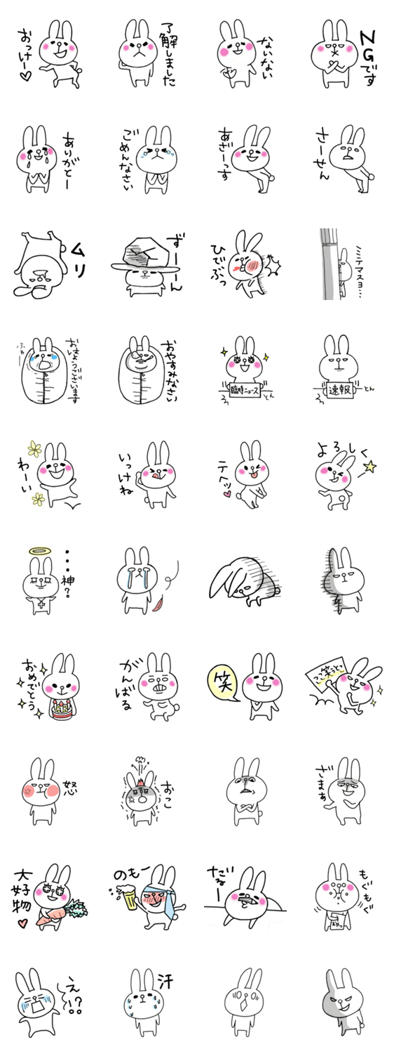 うさぎの日常スタンプ。了解、ありがとう、ごめん、おはよう、おやすみ、おめでとう等のあいさつ。日々使えるかわいいものからシュールなものまで。